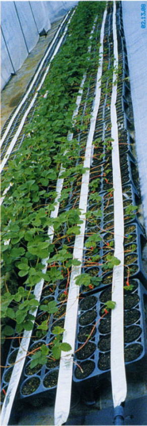 • イチゴの葉を濡らさないから、炭そ病の感染を防ぐ。また、株元に優しい水流で灌水するので跳ね返りもなく感染の拡大を防ぐ効果が大である。