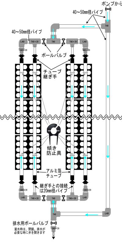 チューブ始端部・終端部ともパイプに接続して、チューブを並列にしてご使用下さい。取水口側の親パイプは直径40~50㎜のものを使用して下さい。各チューブの灌水量を一定にするため循環パイプ(20㎜程度)を付けて下さい。