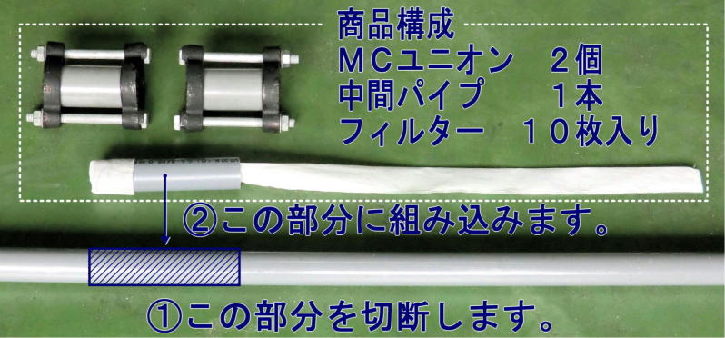 パイプ本管に装着する配管用簡易フィルターを開発致しました。安価なフィルターを交換するだけで目詰まりを防止できる優れた商品です。また中間パイプは、フィルターが破れないよう面取り加工を実施しています。