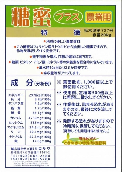 「糖蜜プラス」は、沖縄県産のさとうきびから抽出した糖蜜をベースに開発された、自然由来の有機質資材です。糖蜜液を水で希釈し、バチルス菌を投入して1年間じっくり寝かせることで、菌が糖を餌に繁殖し、すでに活性化した状態で製品化されています。バチルス菌は土壌に定着しやすく、有害な菌を抑え込む働きを持つため、圃場環境の健全化に役立ちます。また、微生物が活発に活動することで土壌内の発酵が進み、地温上昇効果が期待できます。これにより、作物の根の動きが良くなり、光合成が促進され、生育の安定につながります。さらに、糖蜜由来の豊富な糖分やミネラルを補給できるため、作物本来の持つ力を引き出し、食味や品質の向上にも貢献します。農薬や化学肥料に頼らず、土壌と作物の健全なバランスを保ちながら、持続的な栽培を目指す農家様に最適な資材です。